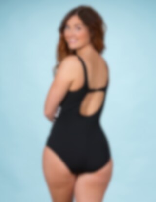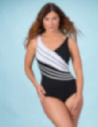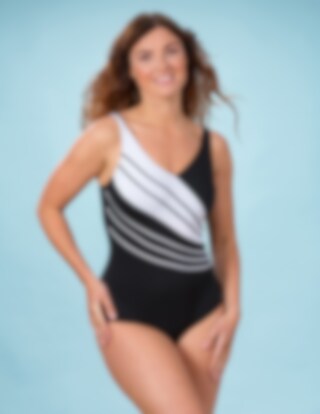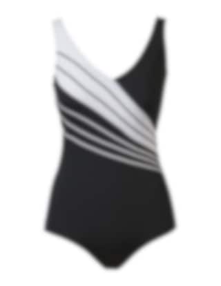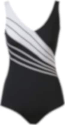 Klorresistent baddräkt med bystfoder och låg benskärning. Dekorativa band på framsidan i kontrastfärger. Spänne i ryggen för bra passform över byst.