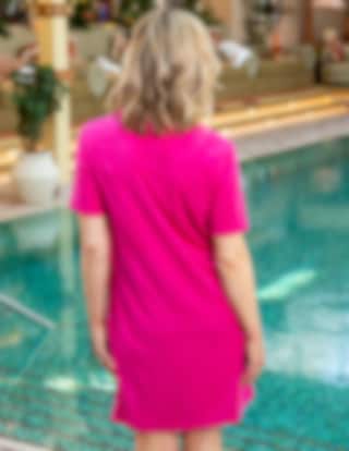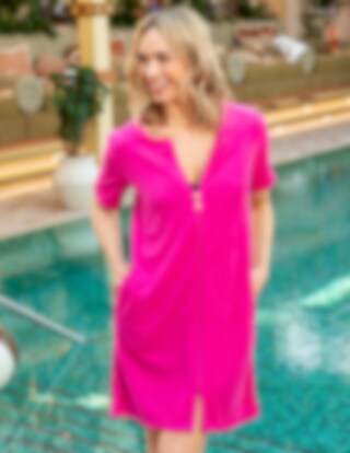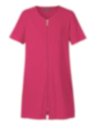 Korte ærmer og frontlukning med dekorativ lynlås.
