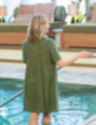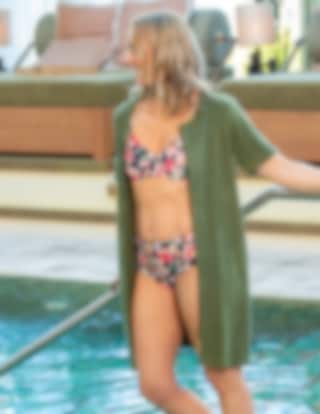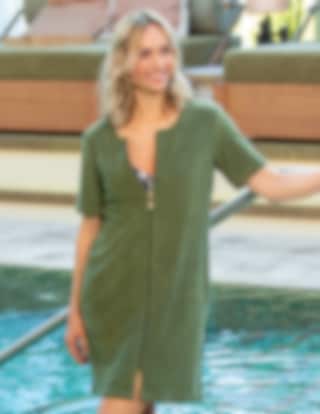 Korte ærmer og frontlukning med dekorativ lynlås.